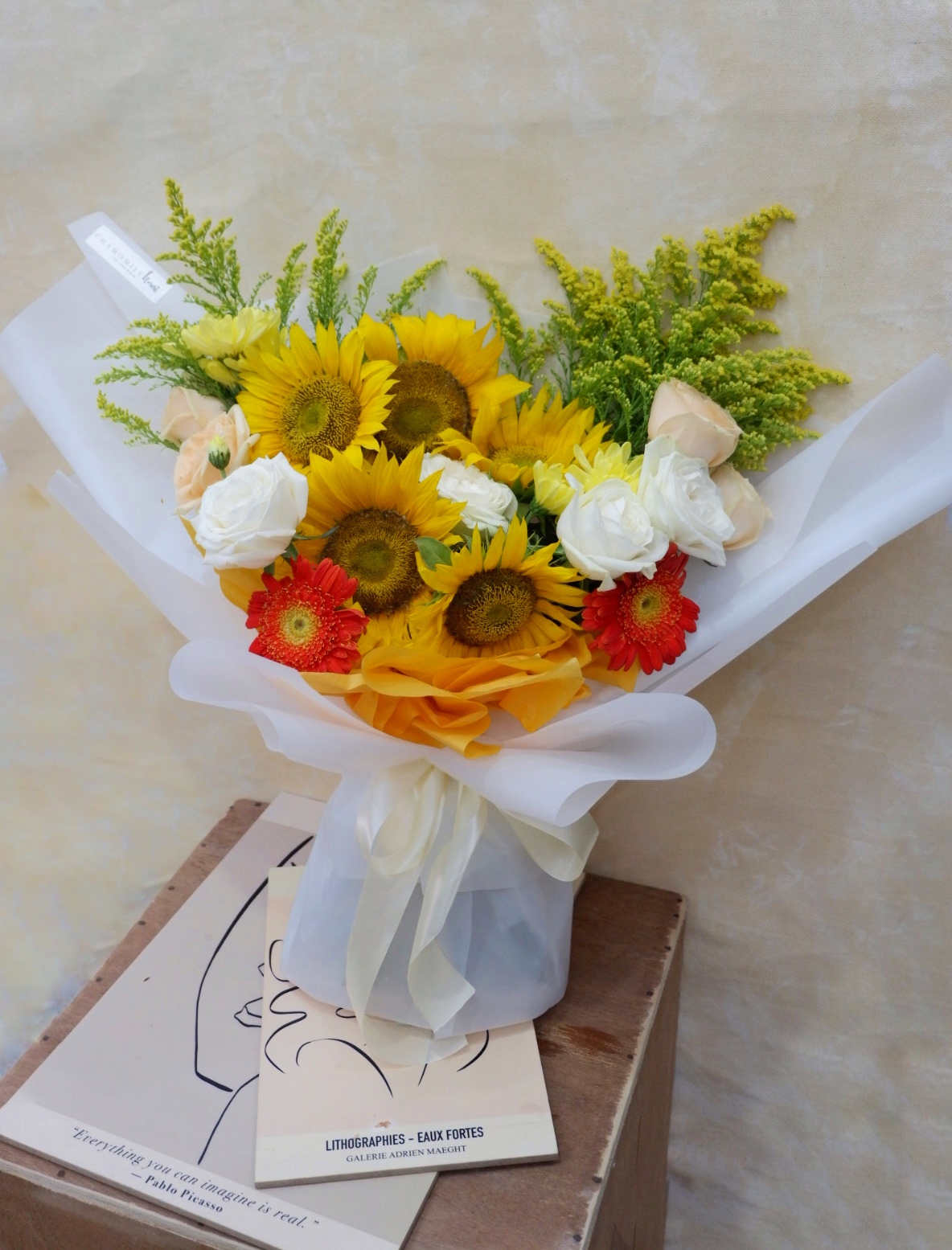 This big bouquet consist of sunflowers and gerbera.