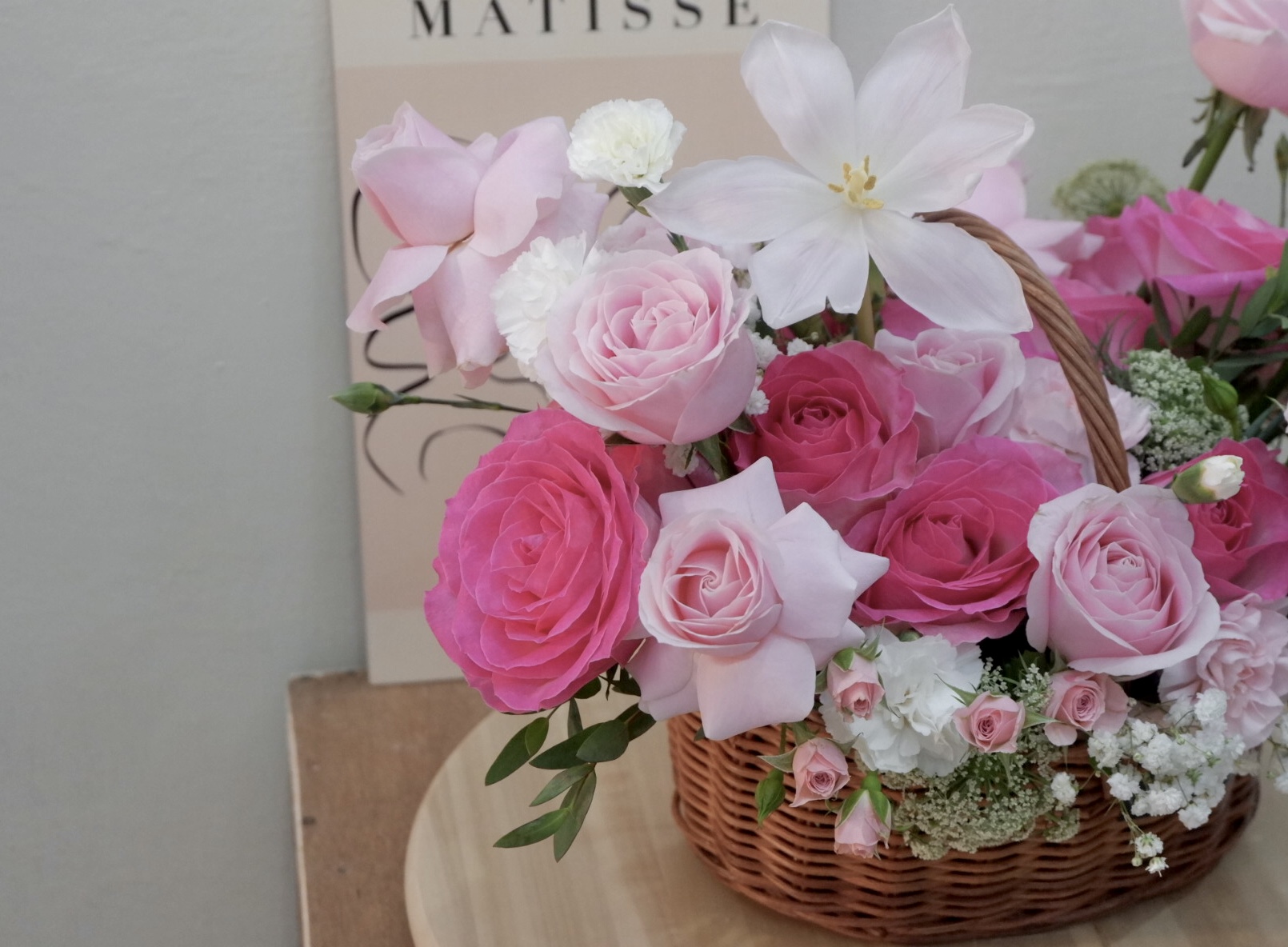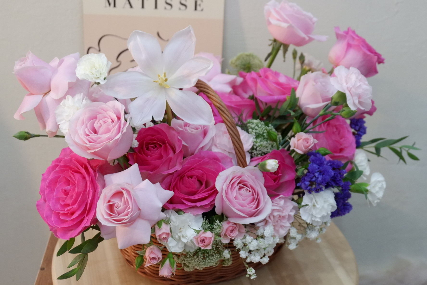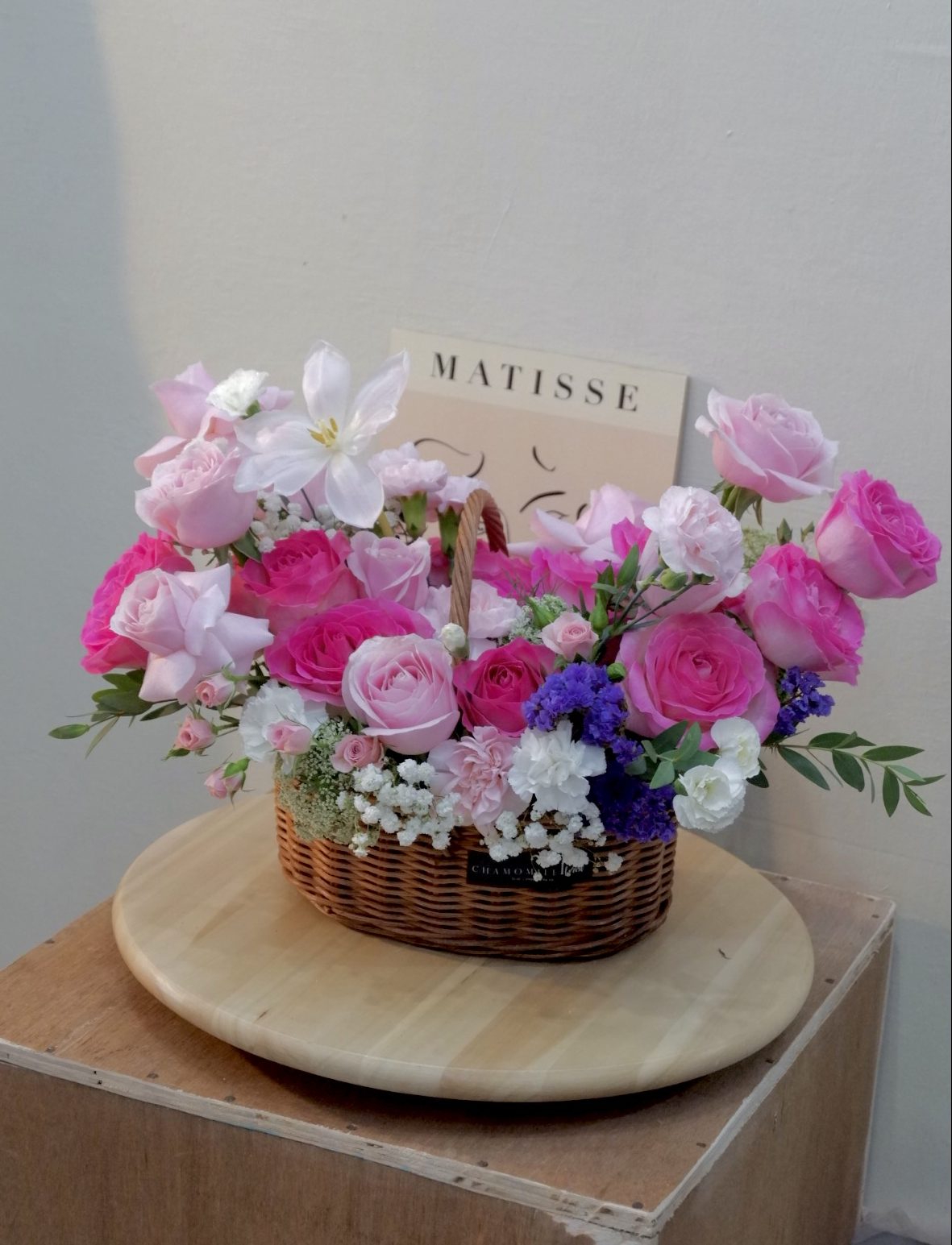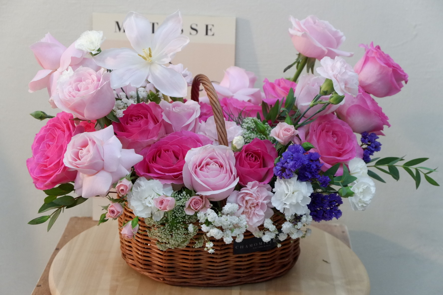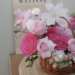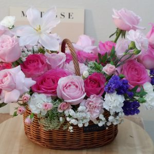 as you can see this basket contains of roses as a main flowers of this basket. with many fillers for make this basket looks beautiful as a gift for your loved one