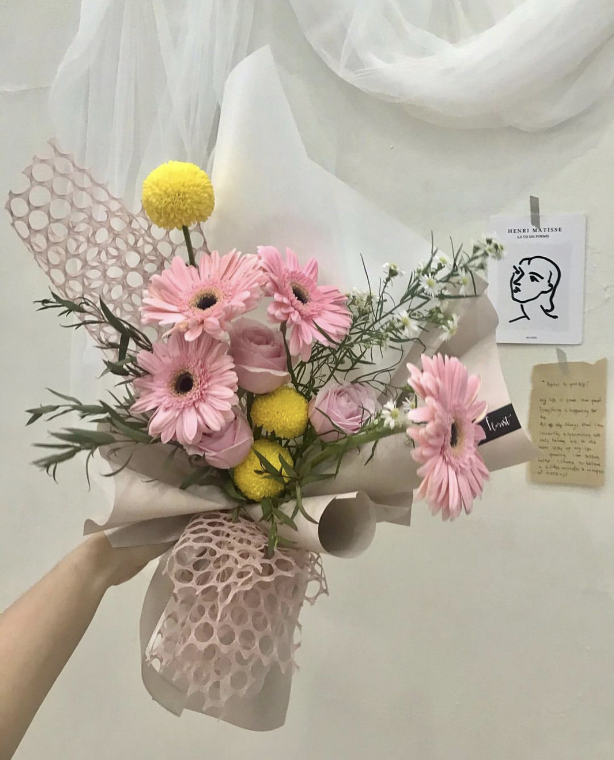 this bouquet consist of Gerbera Flower, Pompom, and many fillers
