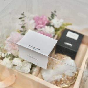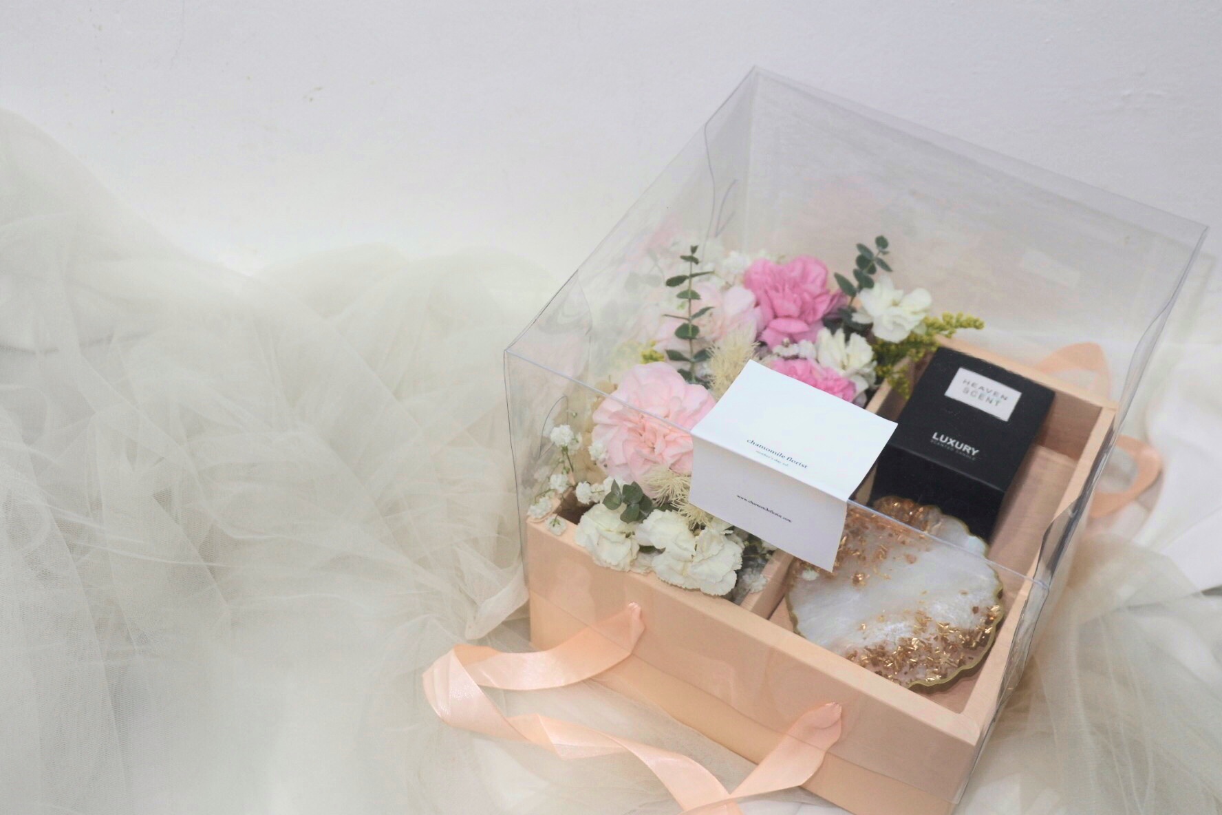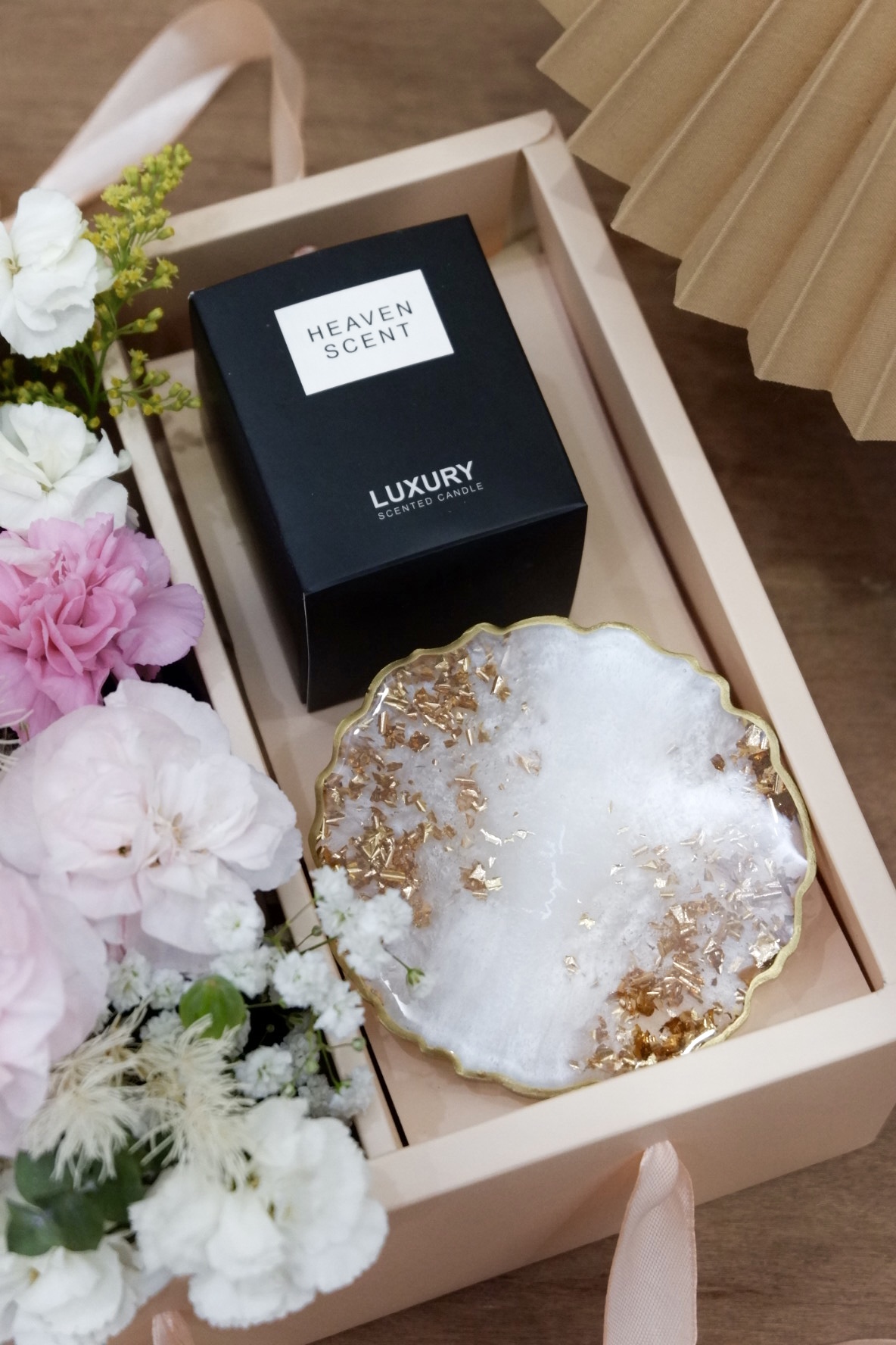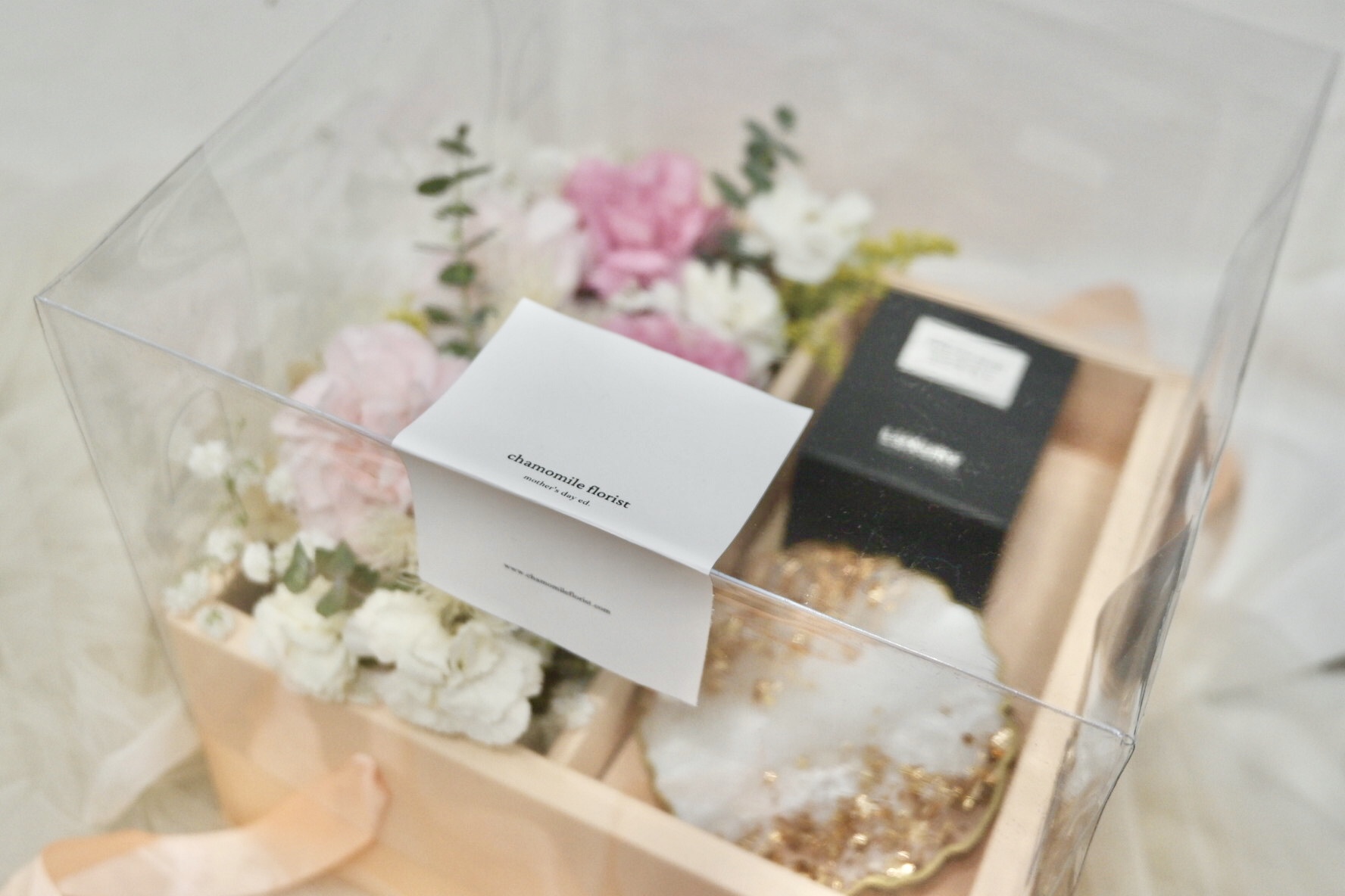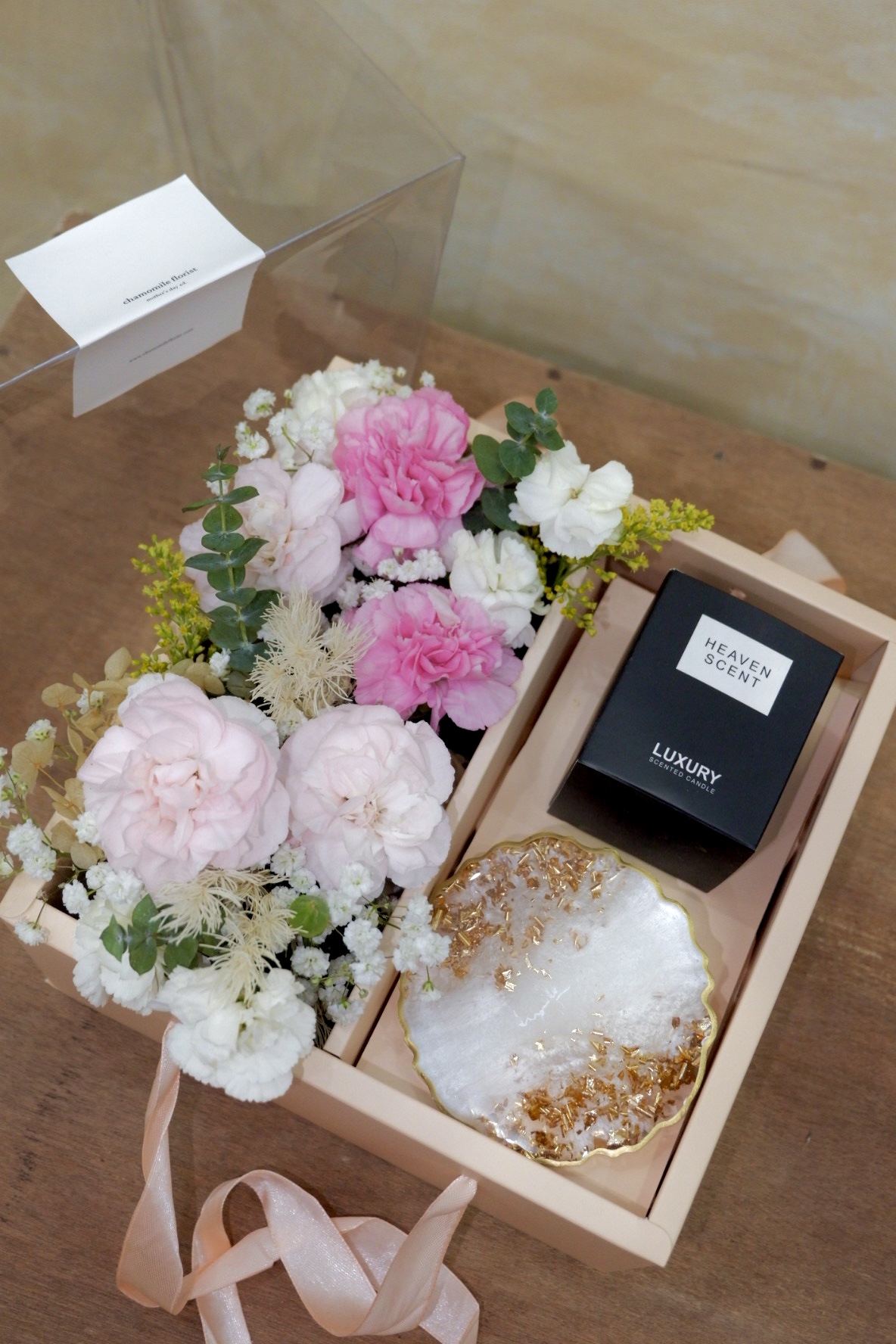 box untuk mother’s day ini adalah special package untuk moment tersebut yang terdiri dari flowers, luxury scented candle dan coaster resin untuk mom kalian. flowers berisikan bunga carnation yang penuh makna karena bunga carnation ini adalah lambang official dari mother’s day.